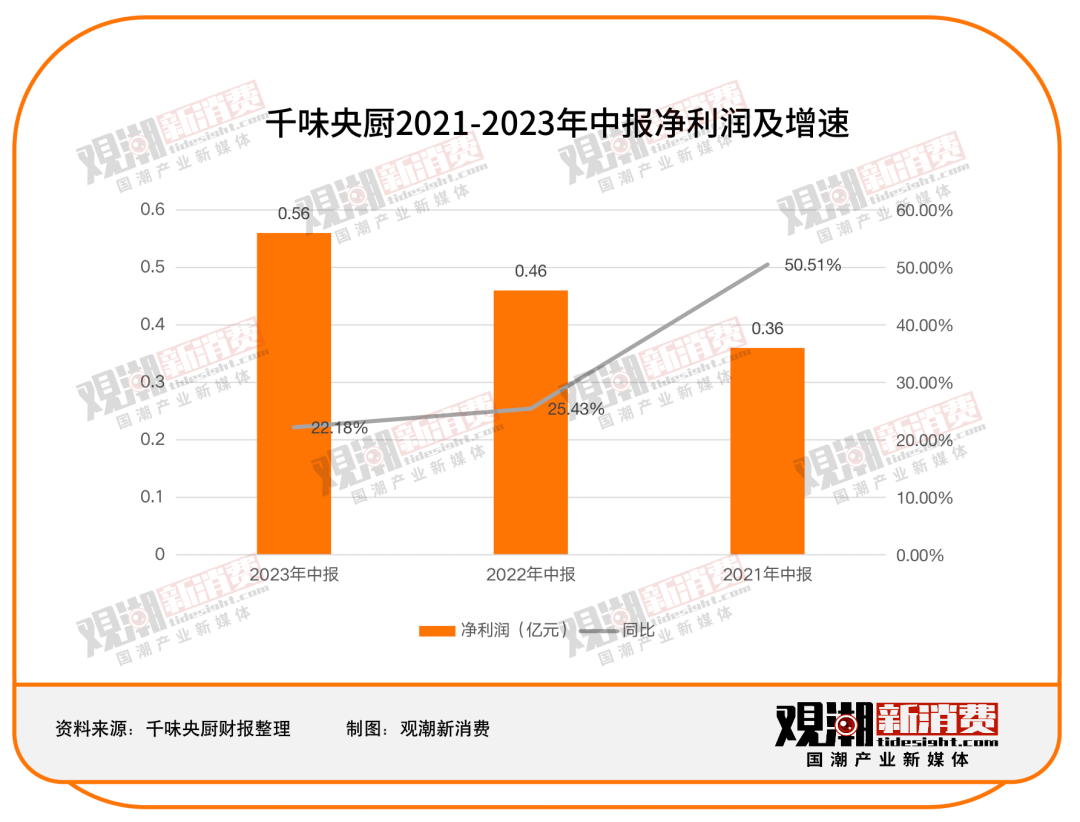 千味央厨2023年上半年实现净利润0.56亿元,同比增长22.18%,相较前两年25.43%和50.51%的同比增速也有所放缓。