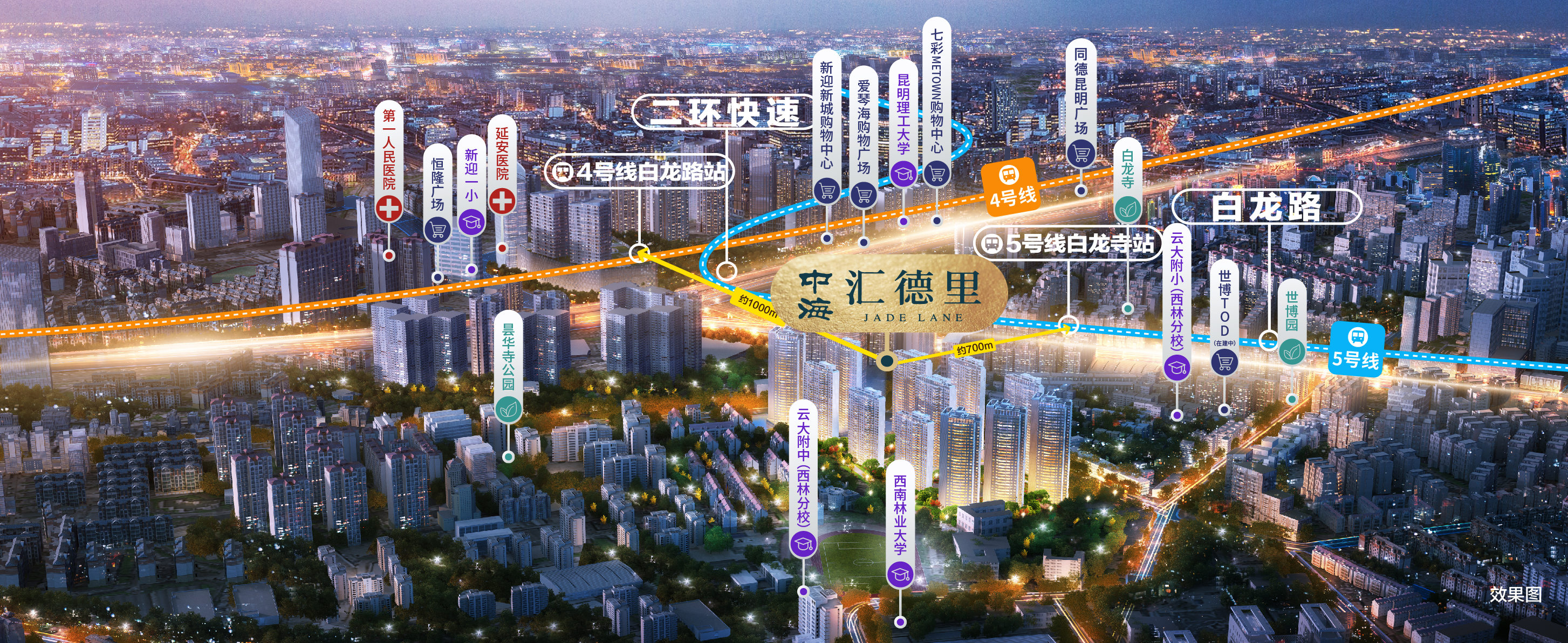 昆明汇德里布局二环白龙板块,拥有爱琴海、新迎新城双MALL配置、同时4/5号线双地铁在侧、三甲医院与教育体系完善,属于昆明核心主城地段。最为难得的是白龙板块基于主城之下,拥有无与伦比的生态资源。昙华寺与世博园,均在汇德里“15分钟舒适生活圈内”。建筑交付易,城市配套交付难。生活是一套完整的体系,购物、医疗、休闲、教育、出行、生态、社交…汇德里认为这套体系,舒适的距离是15分钟。