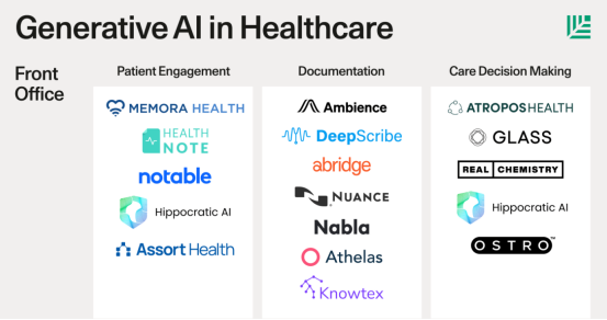 在《Generative AI in Healthcare》这篇报告中,红杉提到了目前AI在医疗领域的一些重要应用,这其中就包括了如患者互动、文档记录、临床决策等。