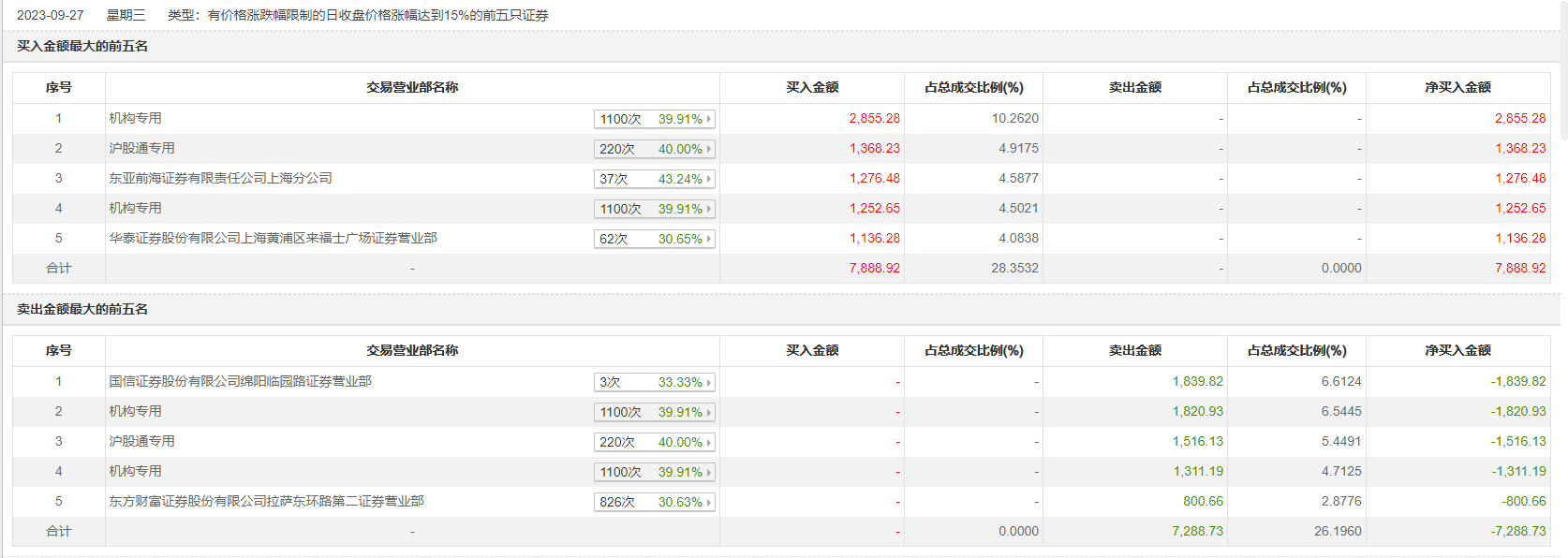 具体来看,机构买入4107.93万元,卖出3132.12万元,合计净买入975.81万元。此外,沪股通专用、东亚前海证券上海分公司分别买入1368.23万元、1276.48万元;国信证券绵阳临园路证券营业部、沪股通专用分别卖出1839.82万元、1516.13万元。