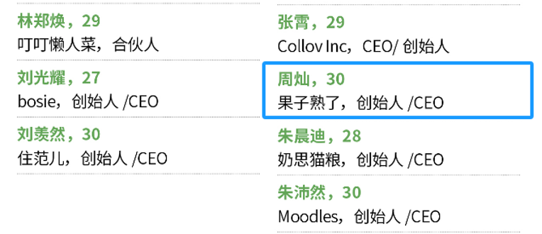 据天眼查显示,果子熟了成立于2019年12月30日,实控人名叫周灿。在福布斯中国发布的《2022年度30Under30榜单》上,周灿作为果子熟了的创始人/CEO榜上有名,那年周灿30岁。