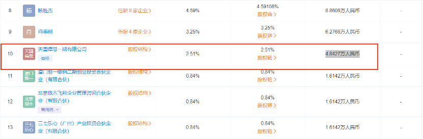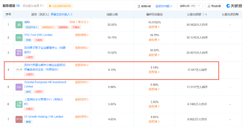 虽然不知道两轮融资情况,但果子熟了13位股东中,深圳市天图东峰中小微企业股权投资基金合伙企业(有限合伙)和天圖偉思一期有限公司分别位列第四和第十大股东,持股比例分别为9.14%、2.51%,认缴资本分别为17.647万和4.8427万元。