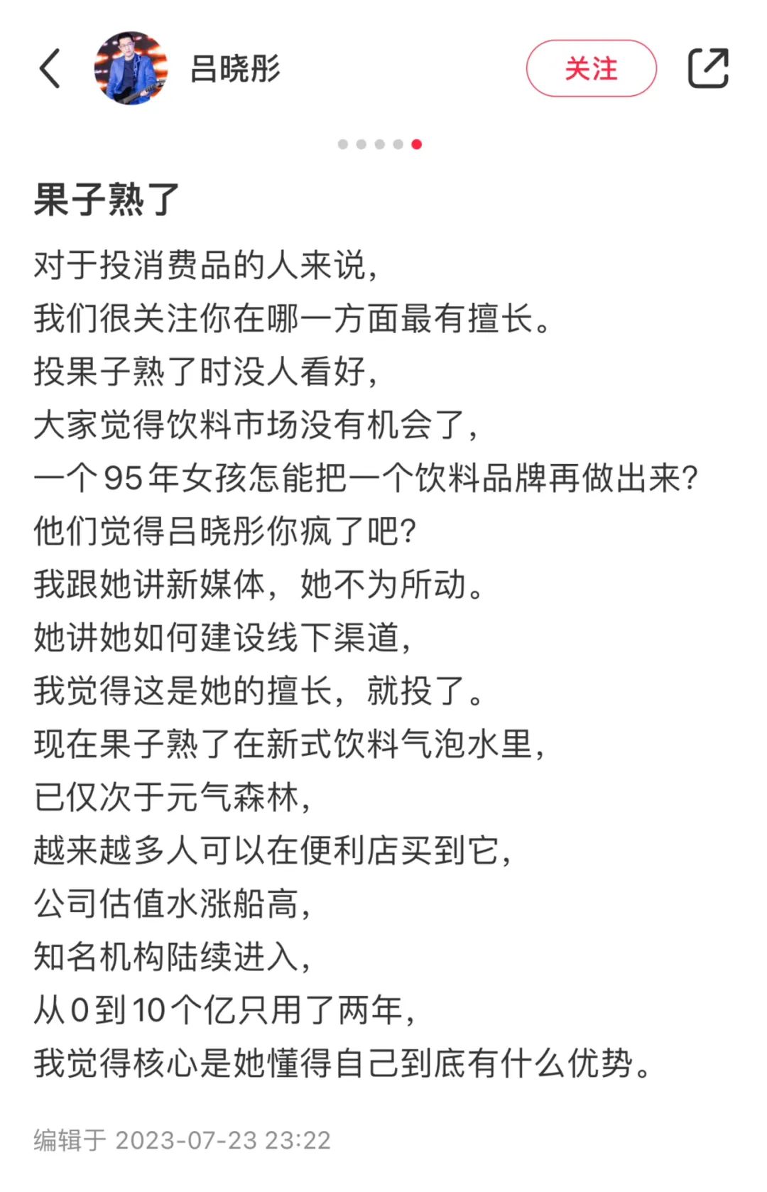 今年7月,微木资本创始人兼CEO吕晓彤在小红书表示,“投果子熟了时没人看好,大家觉得饮料市场没有机会了”、“我跟她(果子熟了创始人周灿)讲新媒体,她不为所动。她讲她如何建设线下渠道,我觉得这是她的擅长,就投了。”