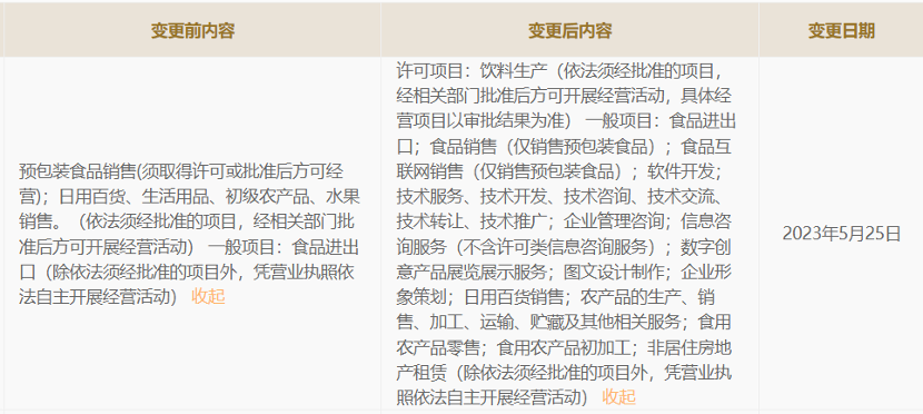 有趣的是,果子熟了在2021年曾变更过一次经营范围,增加了食品进出口一项,似乎有产品出海的意图。