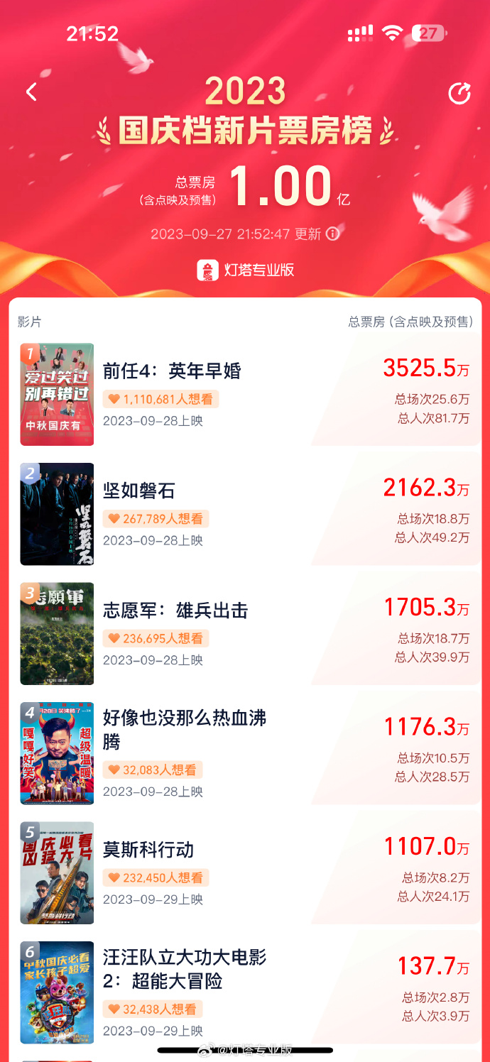 据灯塔专业版,截至9月27日21时52分,2023年国庆档新片预售总票房突破1亿。《前任4:英年早婚》《坚如磐石》《志愿军:雄兵出击》暂列前三位。