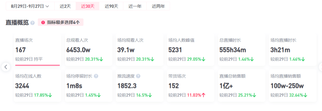 整体的带货效果也大不如前,灰豚数据显示,花西子官方旗舰店抖音直播间近30天的直播数据中,除了带货场次上涨11.03%以外,其余的总观看人次、场均观看人次、场均人数峰值、场均在线人数、场均停留时长等数据全线飘绿。
