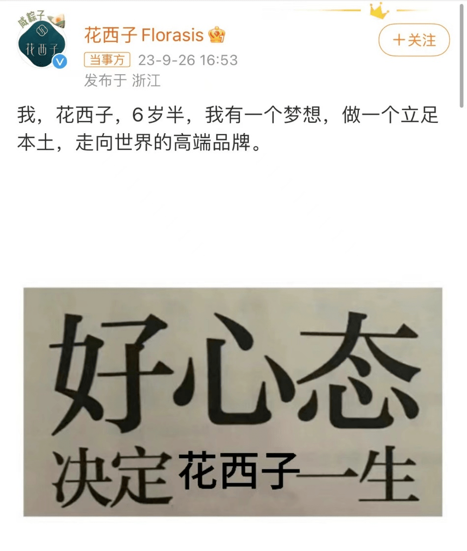 9月26日下午,花西子官方发布一则微博称:“我,花西子,6岁半,我有一个梦想,做一个立足本土,走向世界的高端品牌。”随后更在评论区连发数条评论,走起了“发疯文学”的路线。