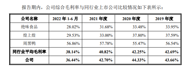 从综合毛利率来看,德州扒鸡2019年—2022年上半年毛利率分布为43.66%、44.33%、42.7%和36.44%;虽低于周黑鸭,但高于同期的绝味食品和煌上煌,甚至比同行平均毛利率水平还要高。