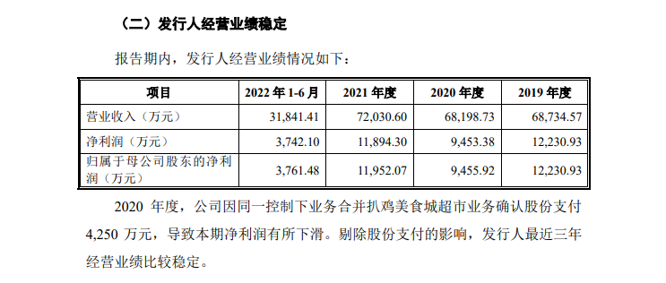 据其最新披露招股书显示,2019年—2022年上半年,德州扒鸡分别实现营收6.87亿元、6.82亿元、7.2亿元和3.18亿元;净利润分别为1.22亿元、0.95亿元、1.19亿元和0.37亿元。