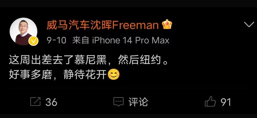 9月初的慕尼黑车展刚落幕,有爆料称威马汽车创始人沈晖已经不在国内,暗指他有“跑路”的倾向。很快,沈晖在社交网络上回应称自己近期在国外出差,并配文“好事多磨,静待花开”。