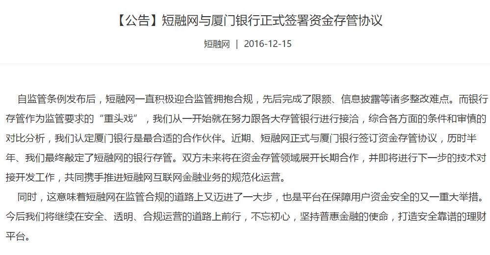 今日,短融网在官网发布公告称,与厦门银行正式签订资金存管协议,不仅如此,短融网还通过短信的方式,向平台所有投资人进行的通知,表示将尽快完成对接,为投资人营造安全、透明、合规的理财平台。