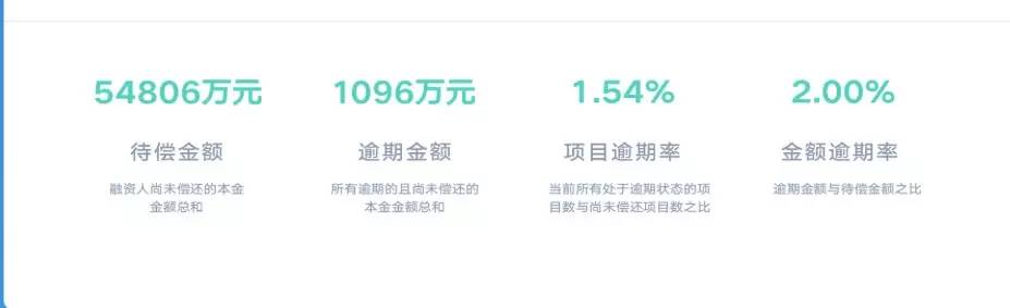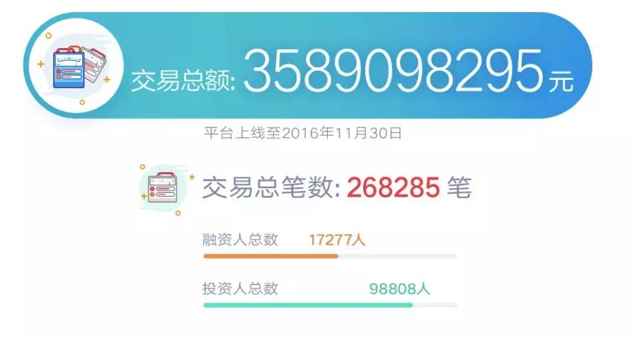 据平台官网显示,平台上线至2016年11月30日,交易总笔数268285笔,交易总额近35亿元,待偿金融54806万元,逾期金额1096万元,项目逾期率1.54%。
