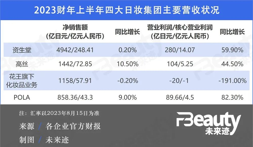 单从化妆品业务来看,花王上半年净销售额为1158亿日元(约合人民币57.96亿元),同比下滑0.2%;核心营业利润亏损20亿日元(约合人民币1亿元),同比下滑191%。在资生堂、高丝、POLA的业绩对比下,花王是唯一一个呈现出亏损状态的日妆集团。