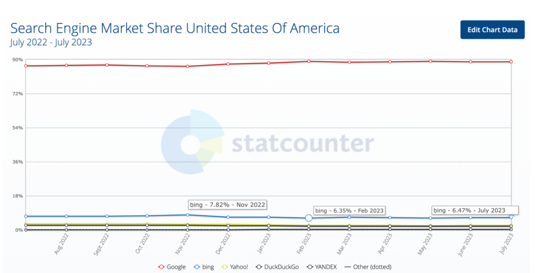然而半年流转,即便掌握了ChatGPT这一利器,必应并未实现其雄心勃勃的目标。根据StatCounter的数据显示,目前必应在北美的市场占有率为6.47%,与2月的6.35%相比仅微涨0.12%,甚至还不及去年11月的7.82%。