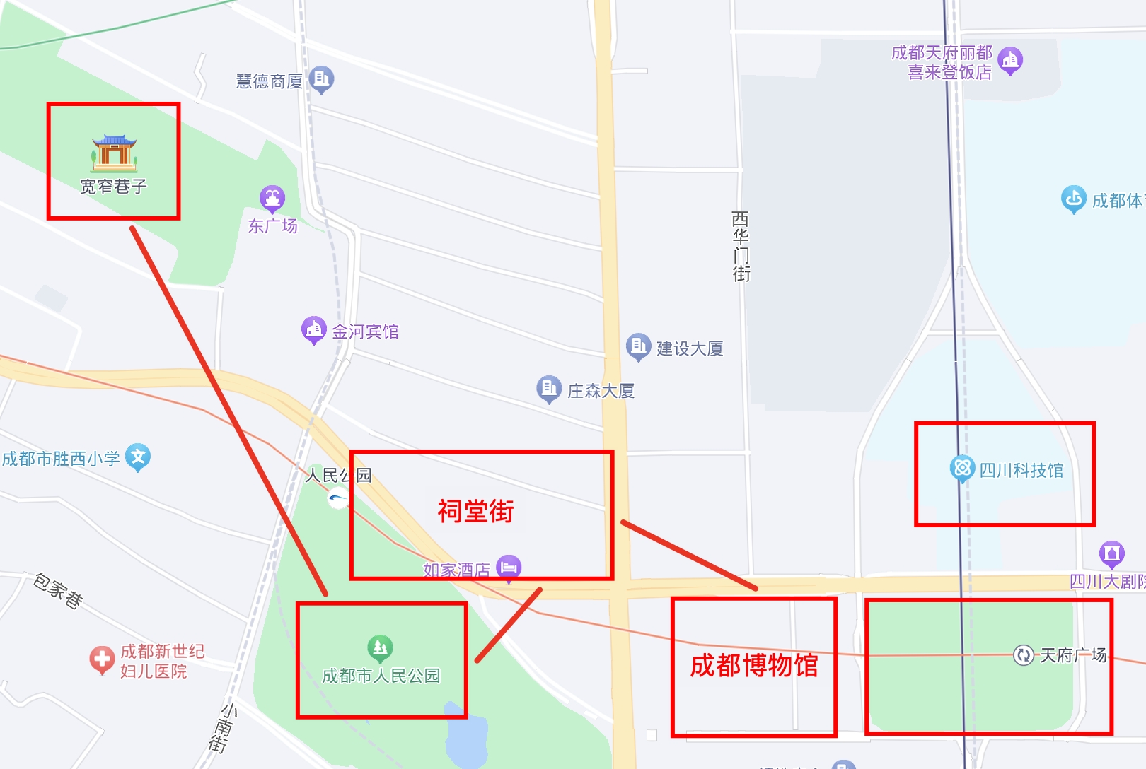 所谓棋要“眼观全局”,当我们聚焦祠堂街周边,会发现宽窄巷子、少城市井文创产业园、人民公园、省美术馆、省图书馆、成都博物馆、天府广场等“顶流”文旅地标,均在步行可触达范围。祠堂街的登场,恰好完整了青羊文商旅模式的“City Walk”动线。