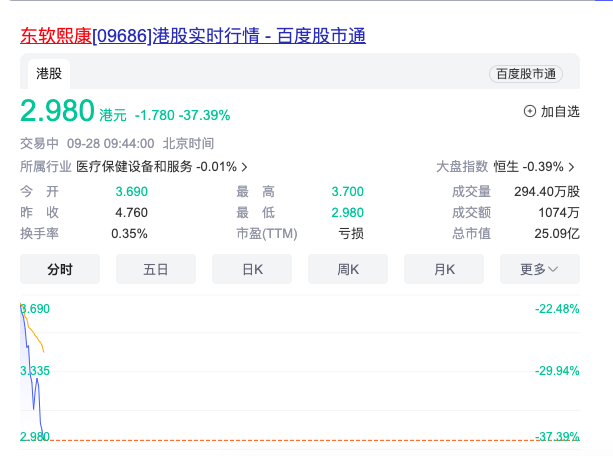 9月28日,东软熙康于联交所主板挂牌上市,发行价为每股4.76港元,开盘跌22.5%至3.69港元;截至发稿前,每股跌37.39%至2.98港元,总市值25.09亿。