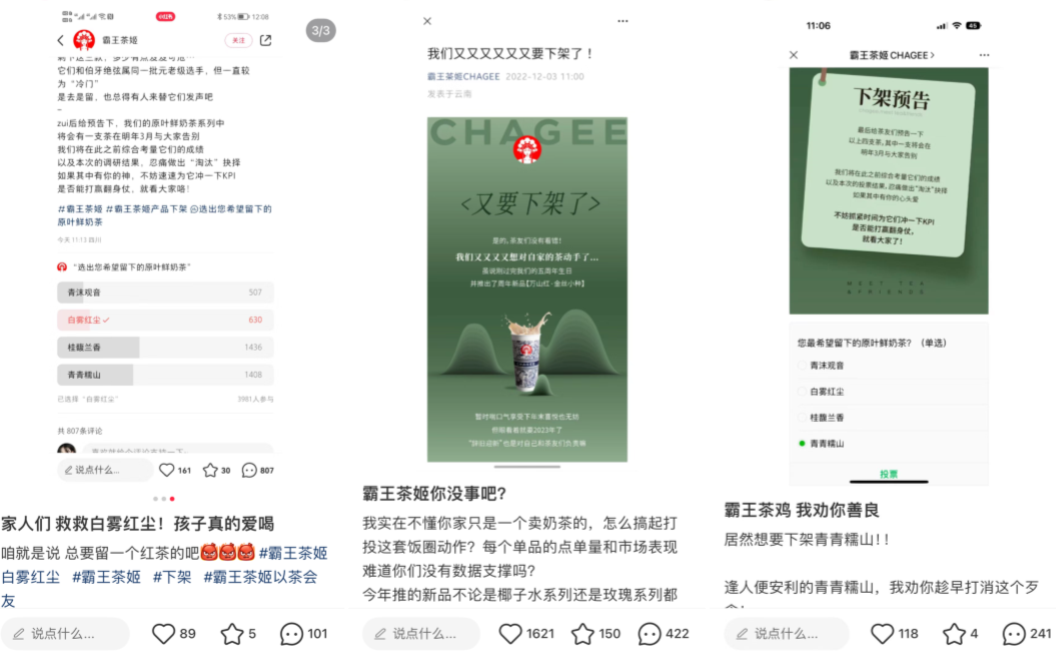 积极回应消费者诉求,原本是霸王茶姬做的较为出色的环节,但从运营手段上来看,霸王茶姬要做的却似乎不止如此。在2022年年末,霸王茶姬选出,青沫观音、白雾红尘、贵馥兰香、青青糯山四款产品,让粉丝投票,获得投票较少的产品,将被下架。
