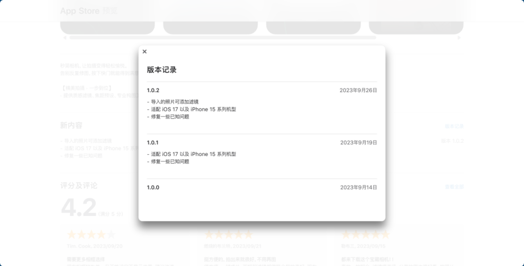 来自苹果应用商店的更新信息还显示,这款产品9月14日上线1.0版本,之后以一个星期迭代一个小版本的节奏,目前更新至1.0.2版本。高频的迭代,主要是为了适配近期苹果刚刚推出的iPhone 15系列机型。