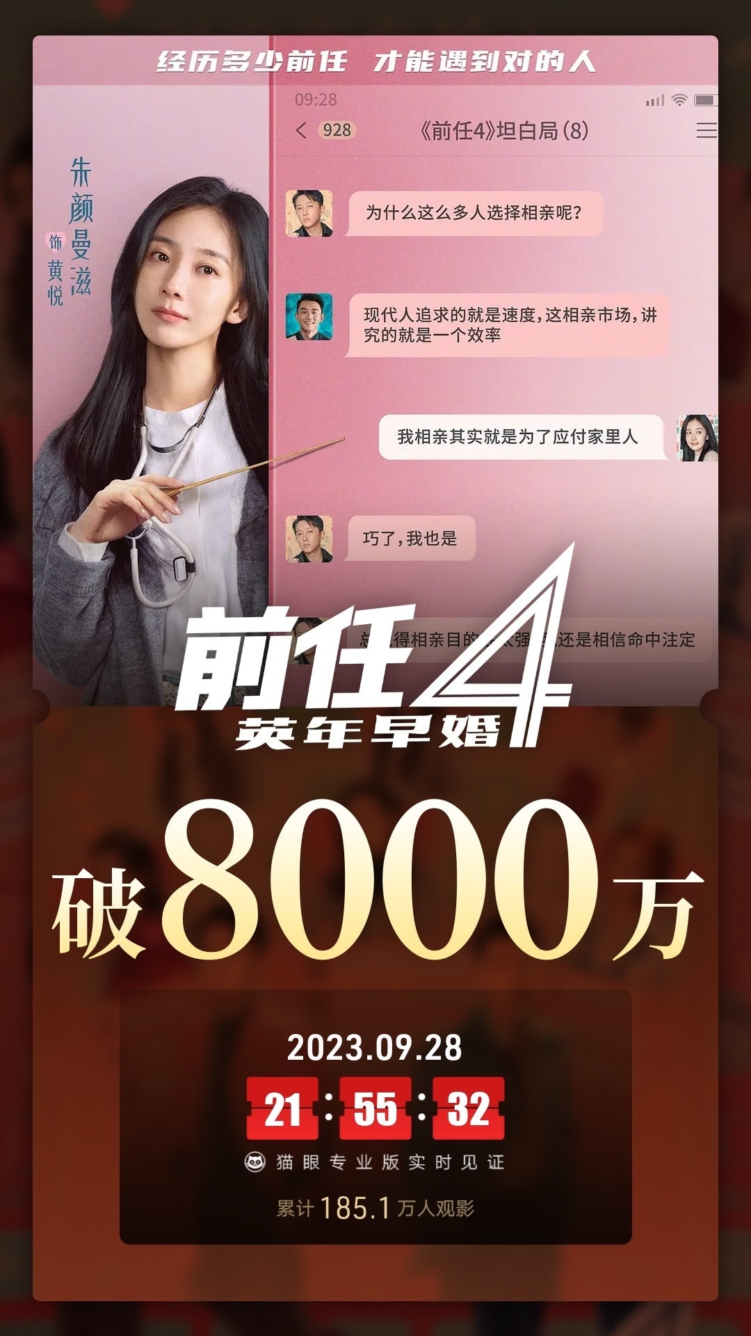 9月28日,据猫眼专业版数据,电影《前任4:英年早婚》上映首日,总票房突破8000万元。