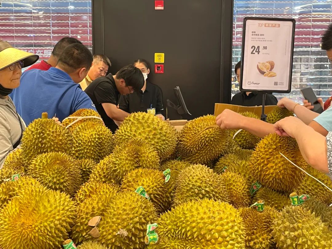 不少生鲜类产品,主打当场享受。大连直发的海胆,现开现吃;现挑的椰子,备有“开椰神器”;越南的金枕榴莲,保证每个不少于四房肉,现场打开、品尝满意后再付款,有消费者对同行者说,“不用开盲盒挺好。”