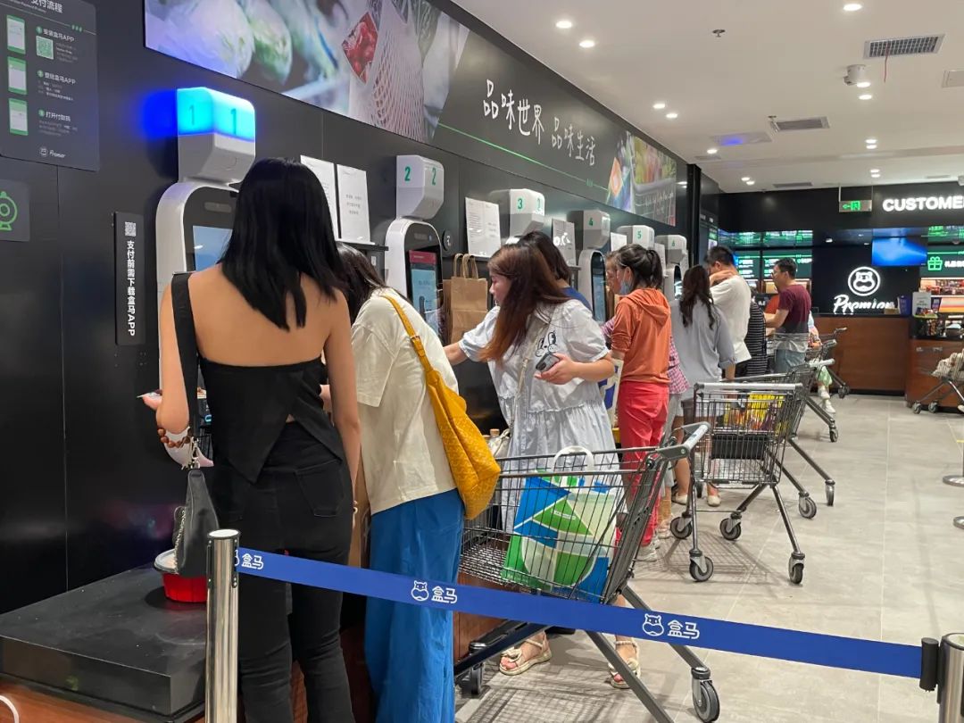 在线下门店买单,有人工现金结账和机器自助两个选项,因为自助机器仅有6个,人流大时稍显拥挤,且必须需通过盒马APP买单。
