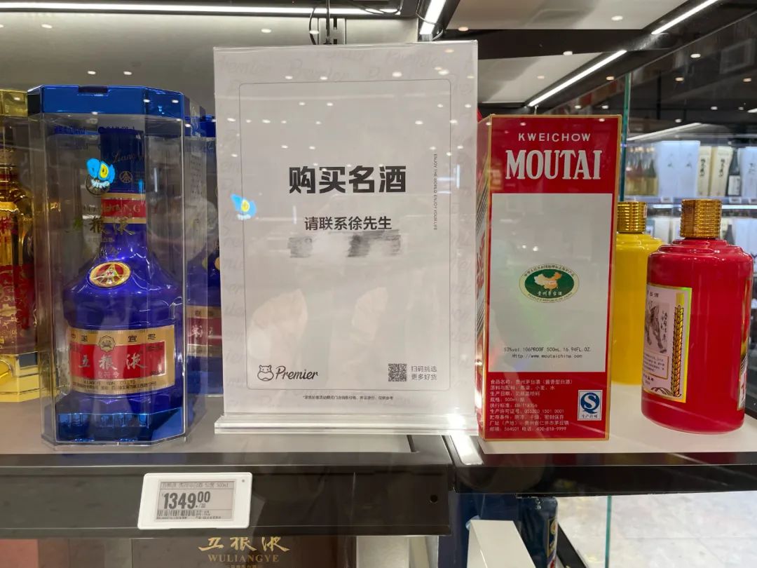 不同于Costco、山姆开业时人们疯抢茅台、爱马仕,这里的白酒静悄悄地站在橱窗内,玻璃上贴着一张“购买茅台请联系XX先生”的纸条。