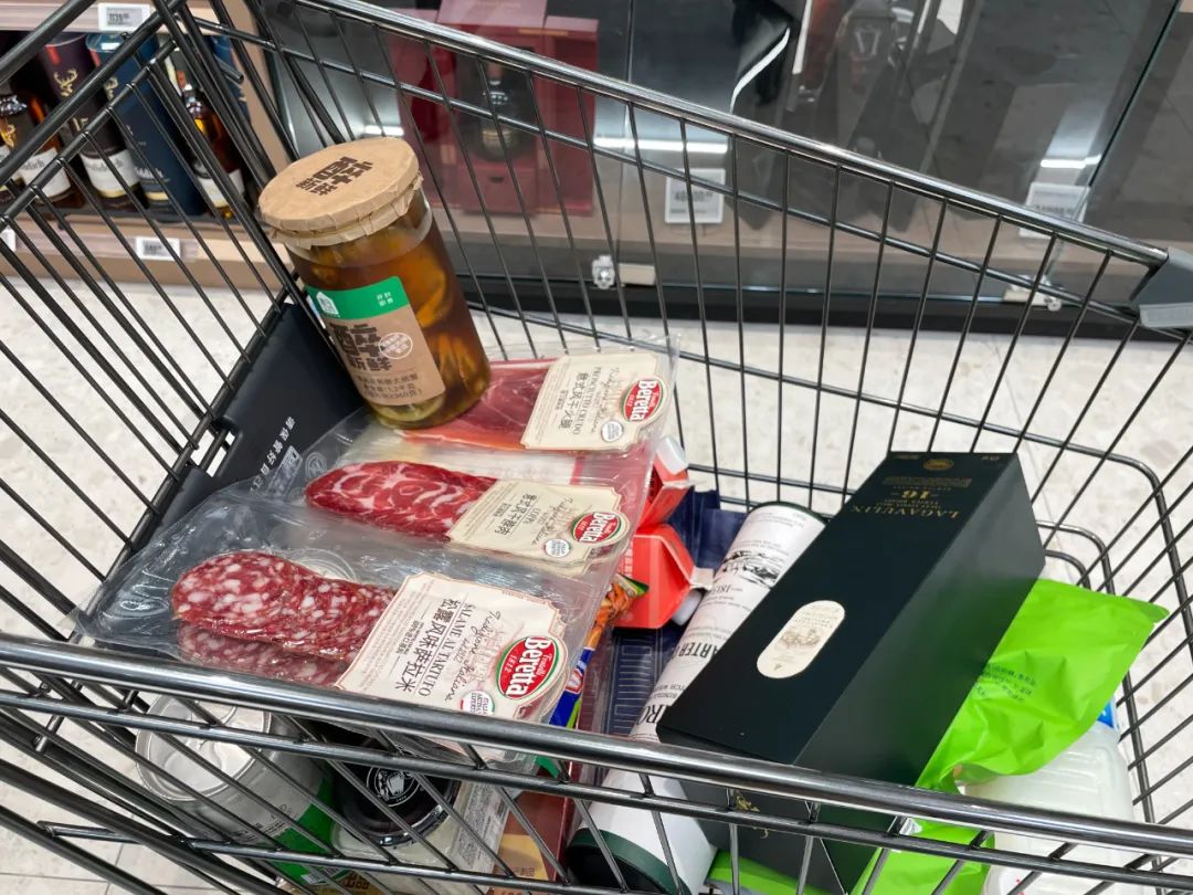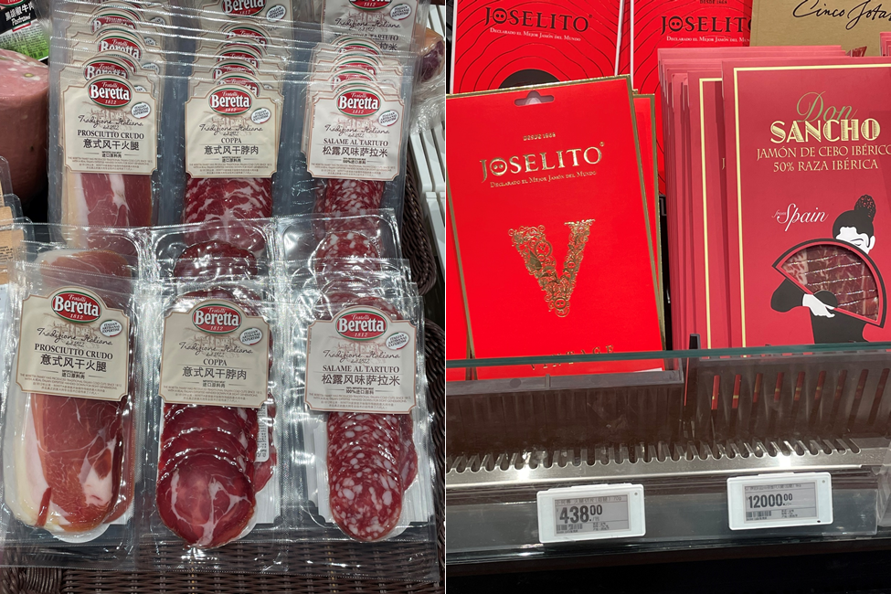 一款几乎“人手一份”的意大利Beretta三合一火腿组合,包含风干火腿、风干脖肉、松露萨拉米,让初阶人群一次性品尝到不同风味。而展柜的另一边,每包售价658元的小何赛火腿切片,满足的是高阶吃货的精细化需求。