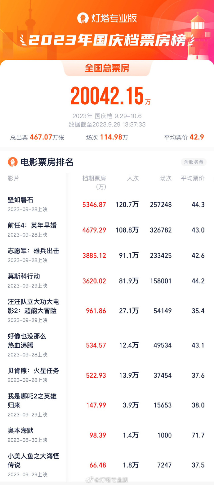 据灯塔专业版,截至9月29日13时37分,2023国庆档(9月29日-10月6日)总票房突破2亿,《坚如磐石》《前任4:英年早婚》《志愿军:雄兵出击》暂居当前档期票房前三位。