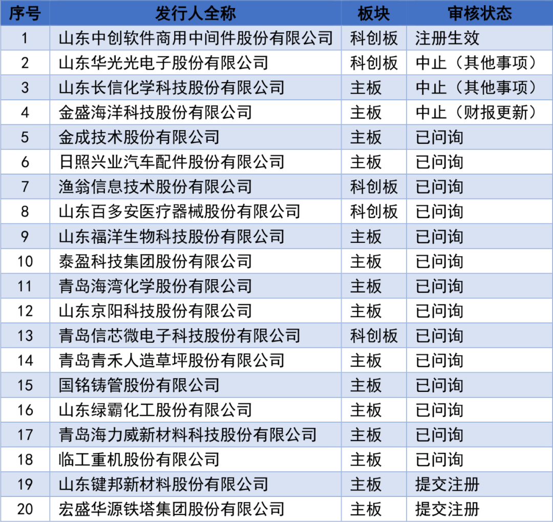 上交所官网信息显示,在审的山东项目共有19个,其中有2个项目处于提交注册阶段。此外,济南企业山东中创软件商用中间件股份有限公司注册生效。