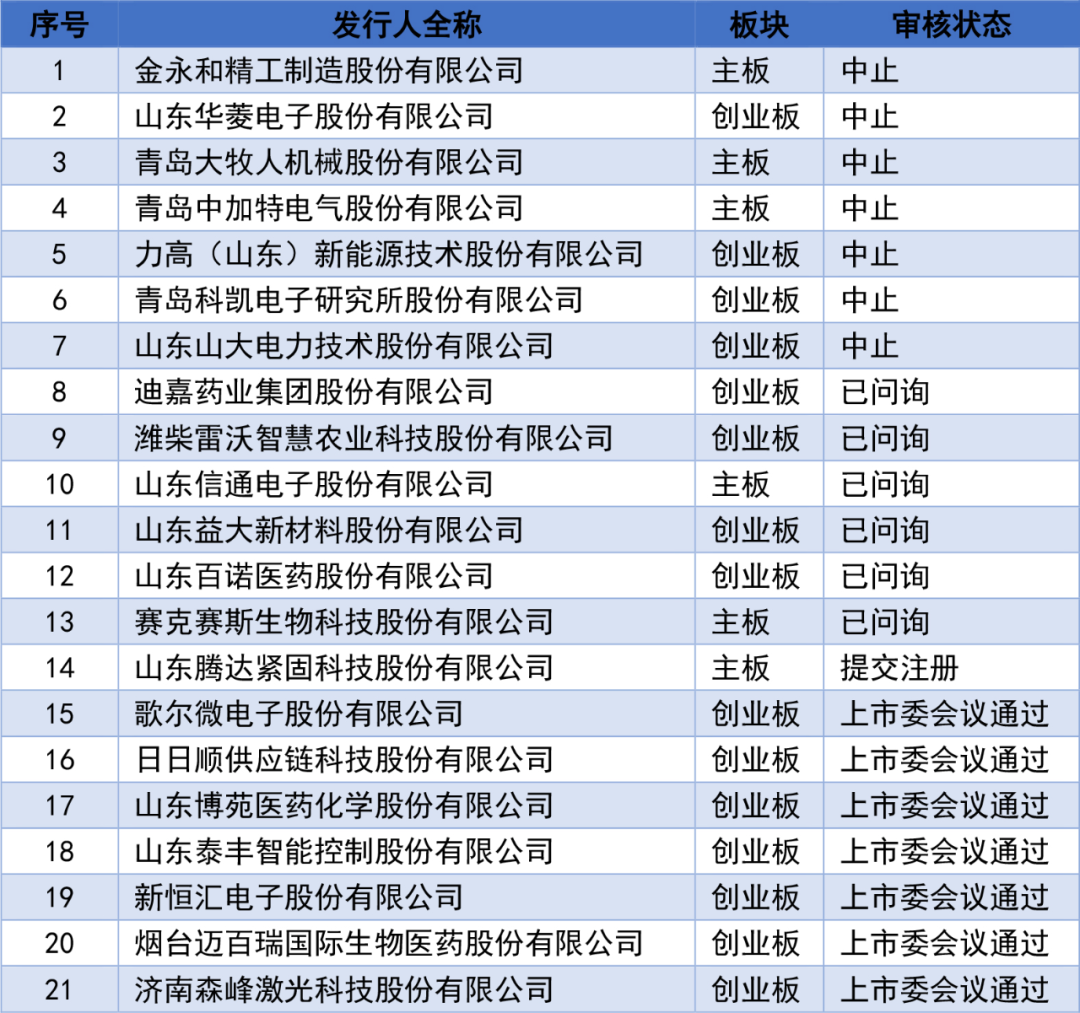深交所官网信息显示,在审的山东项目共21个,其中7家企业审核状态为“上市委会议通过”,1家为“提交注册”。
