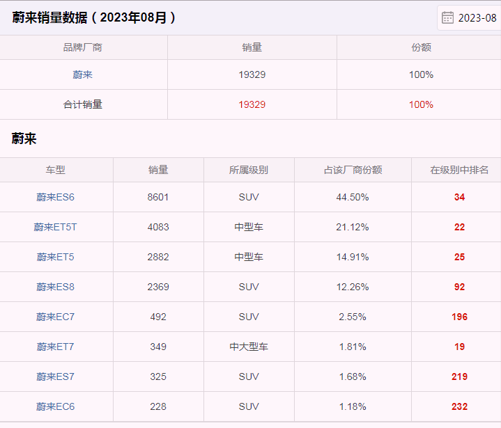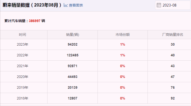 据公告,2023年8月,蔚来共交付新车19329台。2023年1-8月,蔚来共交付新车94352台,蔚来已累计交付383908台(该数据和第三方平台SUV汽车网统计略有出入,但误差不大)。