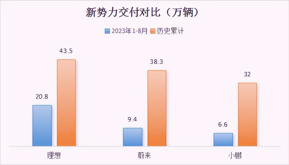 小鹏汽车今年8月交付1.37万辆,前8月销量6.6万辆,历史总销量大约32万辆。理想汽车8月交付34914辆,前8月总交付量为20.8万辆,是蔚来两倍多。理想在今年销量大幅增加情况下,历史总销量超过43.5万辆,超过蔚来。