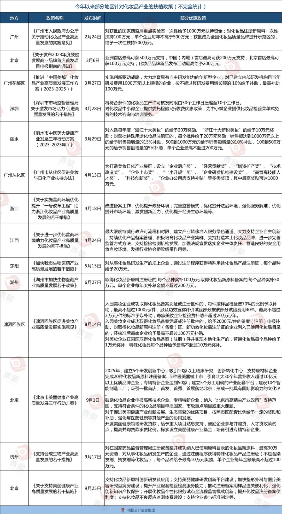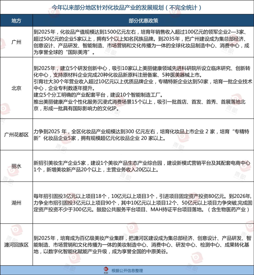 譬如,广州在年初发布的《广州市人民政府办公厅关于推动化妆品产业高质量发展的实施意见》中明确表示,对获批的国家药监局重点实验室一次性给予1000万元扶持资金,获批成为全国化妆品质量品牌提升示范区的,给予一次性扶持500万元;对化妆品注册新原料一次性扶持100万元,单个企业每年不高于500万元。