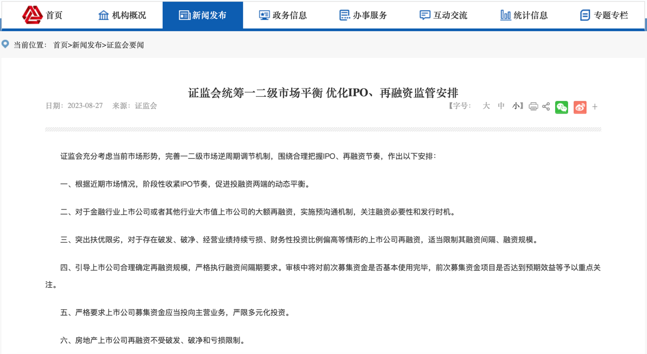 值得一提的是,8月27日,证监会网站曾发布消息称,充分考虑当前市场形势,完善一二级市场逆周期调节机制,围绕合理把握IPO、再融资节奏,作出六项安排。