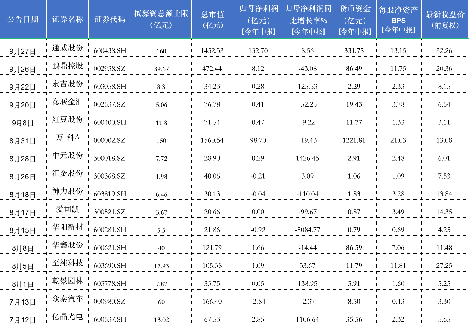 从这16家公司拟募集资金规模上限来看,募资超百亿的有通威股份、万科A,分别拟募资高达160亿元和150亿元,其次是众泰汽车(000980.SZ)60亿元、华鑫股份(600621.SH)40亿元、鹏鼎控股39.67亿元、至纯科技(603690.SH)17.93亿元、亿晶光电(600537.SH)13.02亿元、红豆股份(600400.SH)11.8亿元,其余公司拟募资规模均在10亿元以下。
