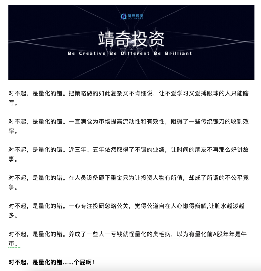 据21世纪经济报道,代表人物如九坤投资创始人王琛、灵均投资董事长蔡枚杰等,他们在8月28日夜间转发了一篇“量化才是大A脊梁”的相关文章,并配文:“中国量化已经承受了太多莫须有的恶意,说量化砸盘纯属无知”,“永远满仓的中国量化基金,才是大A的脊梁。”8月29日上午,靖奇投资在其官方公众号发布文章《对不起,是量化的错!》称:“我们是量化,我们是最坚定的做多者,永远满仓热泪盈眶,不背锅。”