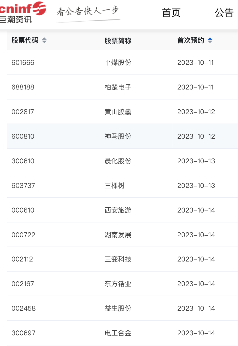 根据巨潮咨询,沪深京三市中,拔得头筹的是两家沪市公司,平煤股份(601666.SH)和柏楚电子(688188.SH),预约披露时间为10月11日。