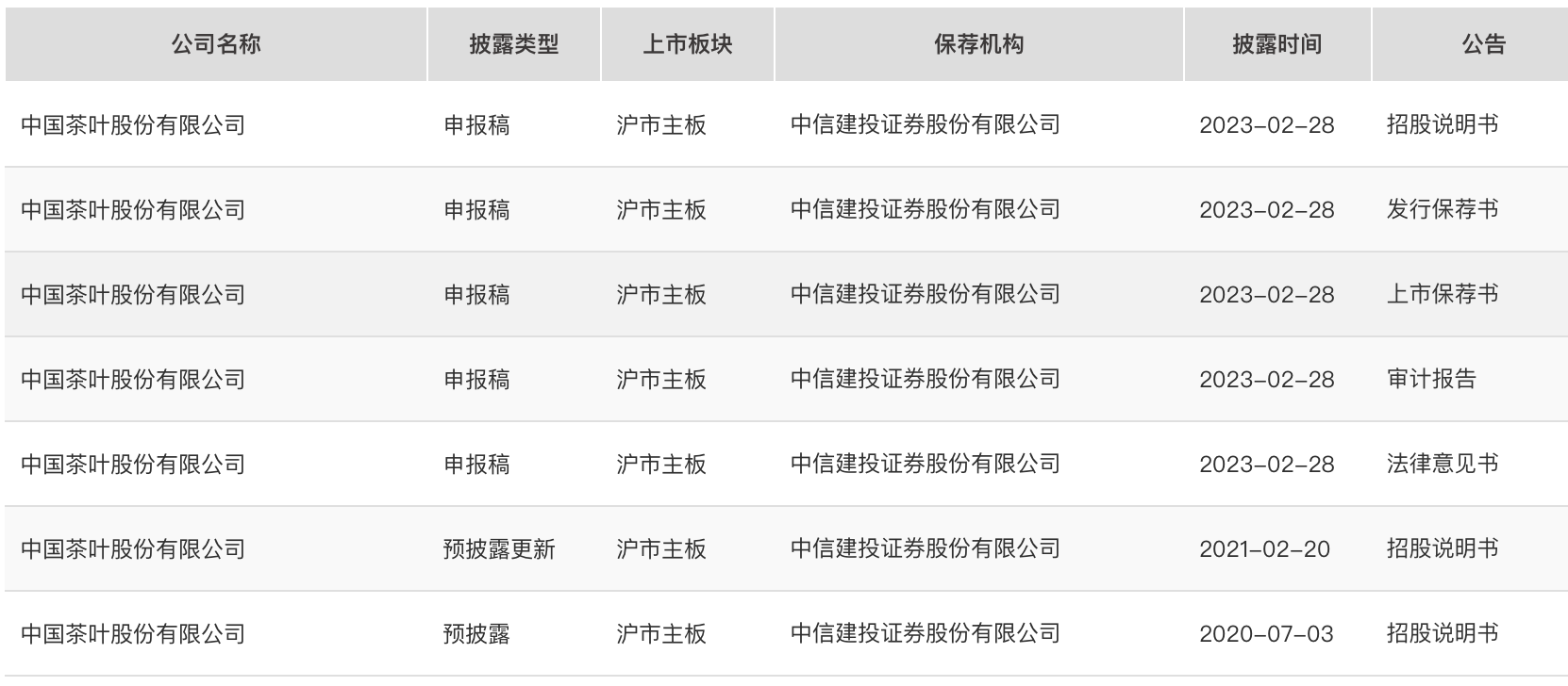 从披露看,中国茶叶早在2020年7月3日进行了预披露,2021年2月20日进行了预披露更新,目的地沪市主板,保荐人中信建投证券,后在2023年2月28日平移,2023年3月15日进入了问询环节。不过中国茶叶3月31日因财务资料过有效期而中止,6月30日公司提交了新的财务资料,恢复了进程。但截至目前,中国茶叶对第一轮问询并未有回复公告的披露。