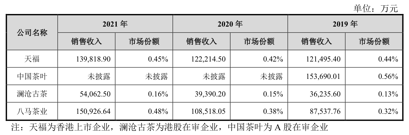 从披露看,八马茶业2021年的市场份额为0.48%,相比下天福为0.45%,澜沧古茶为0.16%。