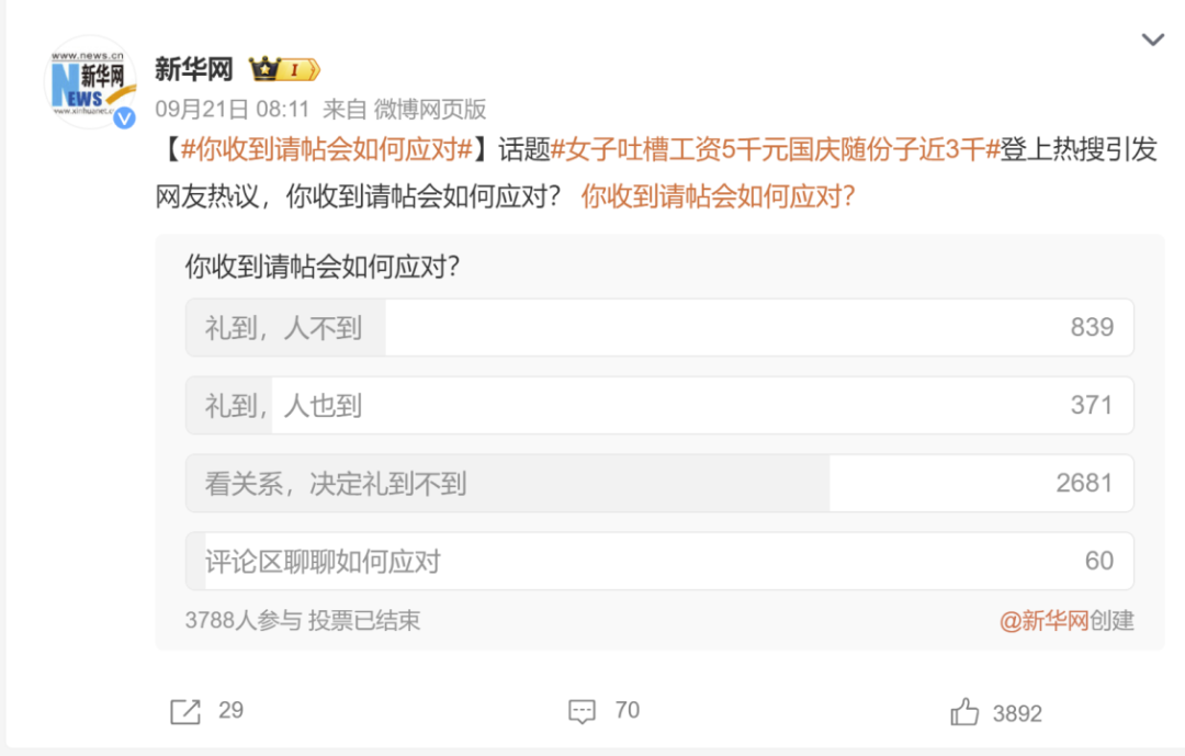 近日“大学生蹭酒席随礼100元被指太少”“女子吐槽工资5千元国庆随份子近3千”等话题冲上热搜,再次引起了网友对“随份子”的强烈热议。