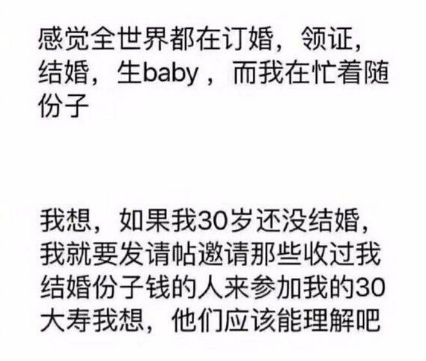 也无怪乎许多许久不联系的亲友,会突然地出现,一面聊表关心,一面扔下红色炸弹。毕竟只要收到请帖,大部分人碍于面子总要掏钱以示心意。