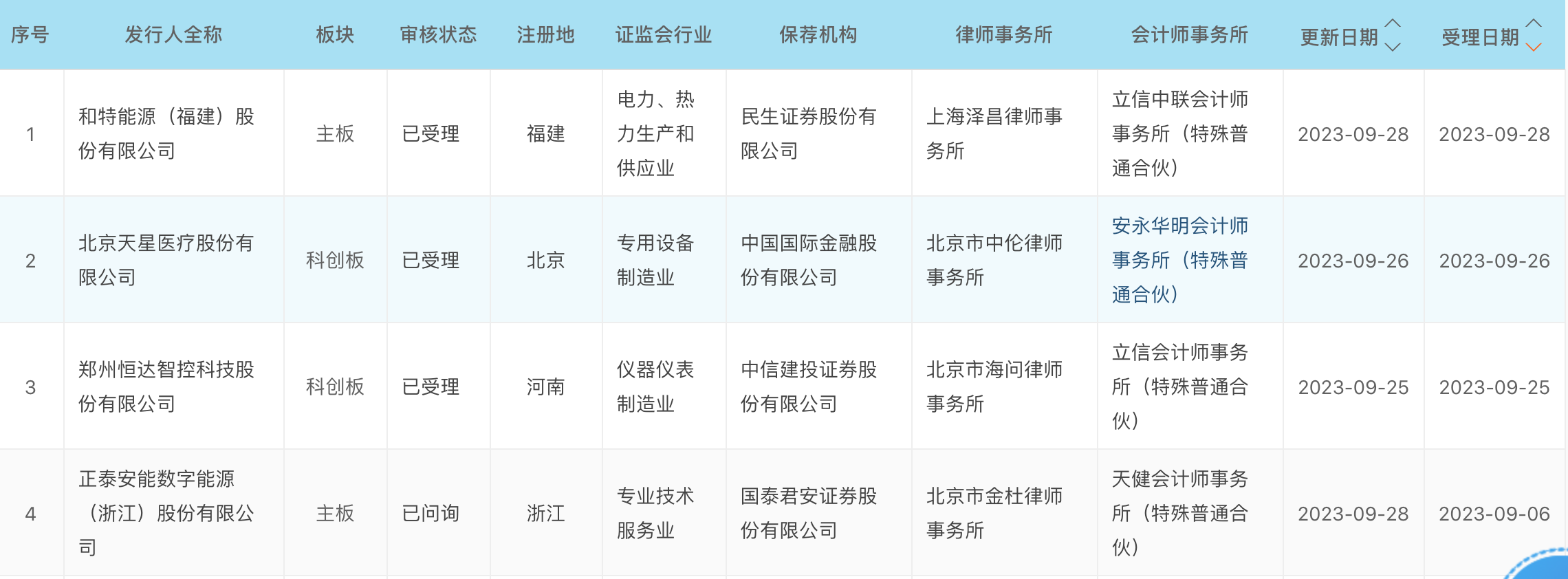 根据上交所网站,9月28日受理和特能源(福建)股份有限公司,9月26日受理北京天星医疗股份有限公司,9月25日受理郑州恒达智控科技股份有限公司(下称恒达智控),再加上9月6日受理的正泰安能数字能源(浙江)股份有限公司(下称正泰安能),上交所9月来合计共受理了上述4家。其中,正泰安能计划融资额为60亿元,恒达智控计划融资额为25亿元。