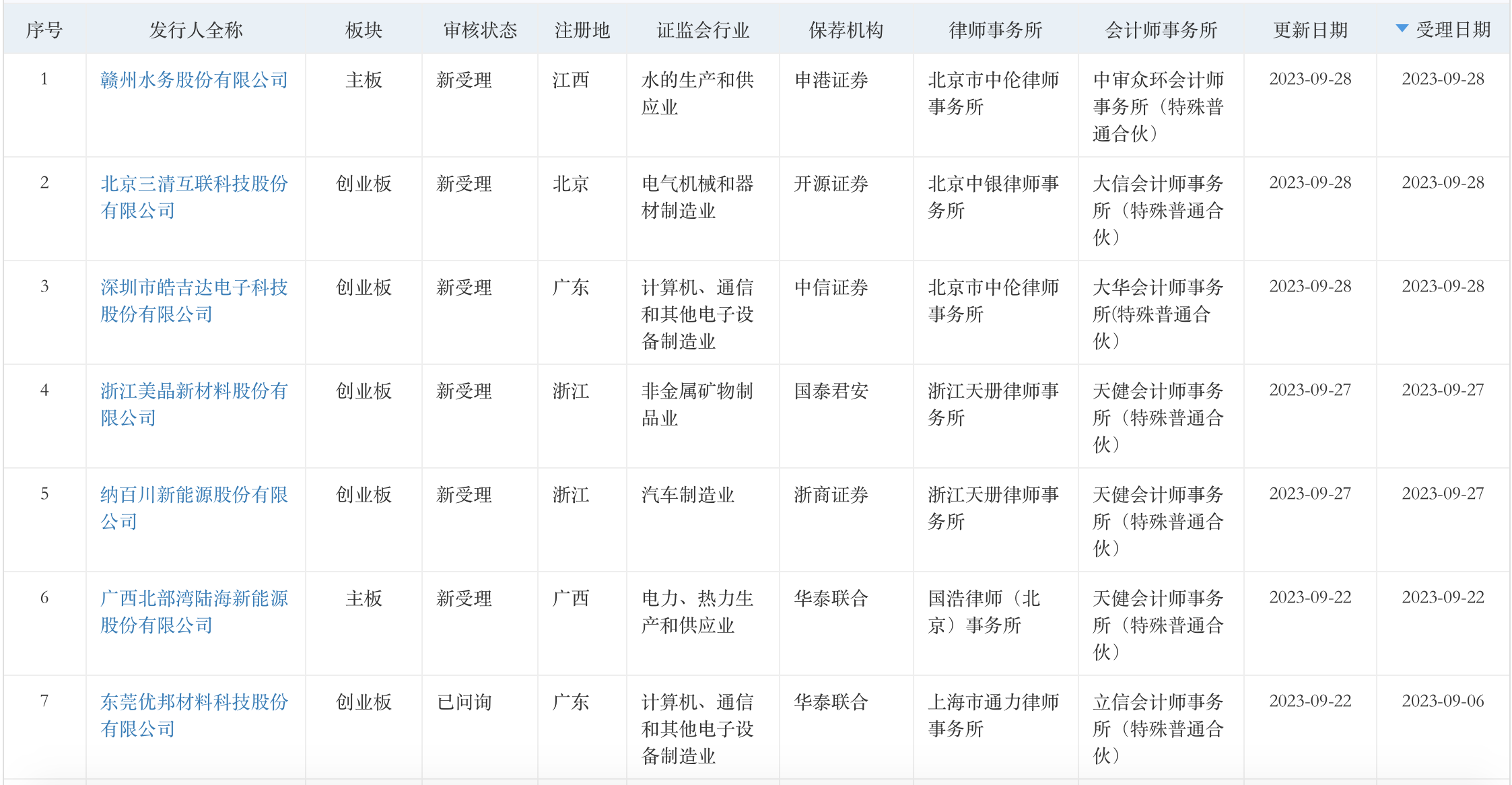 深交所方面,节前一周也共新受理了5家公司,连同此前9月22日和9月6日分别受理的广西北部湾陆海新能源股份有限公司(下称陆海新能)、东莞优邦材料科技股份有限公司,深交所9月份共计新受理了7家公司。这7家公司中,陆海新能的融资计划额16亿元为最大,另一家浙江美晶新材料股份有限公司的预计融资金额15个亿。