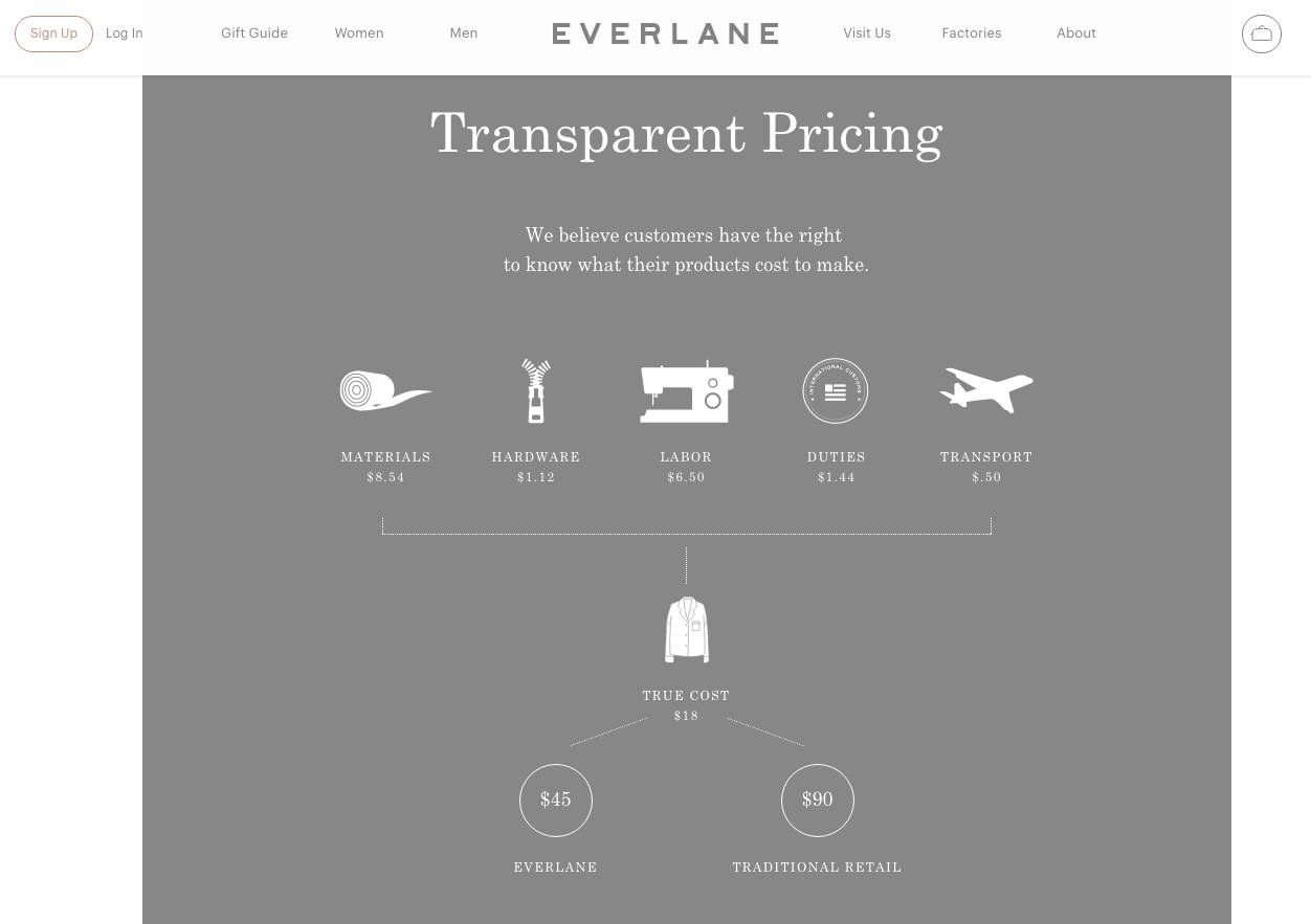 EVERLANE给每一件衣服都标明了成本,标价45$的衬衣,成本为18$,商场零售90$。
