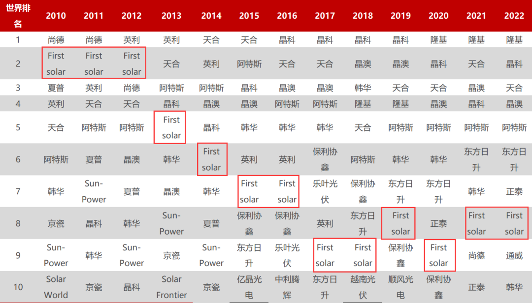 2010时TOP10中,仅有尚德、英利、天合、阿特斯四家中国企业;