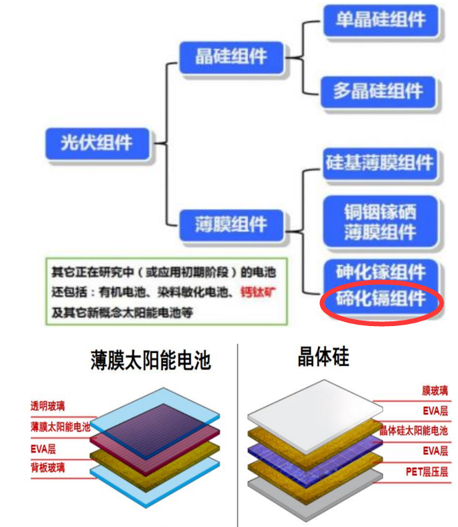 薄膜电池现已发展出包括碲化镉(CdTe)、铜铟硒(CIS),铜铟镓硒(CIGS)、砷化镓(GaAs),和铜锌锡硫(CZTS)等多种技术路线,其中碲化镉是目前为止市占率最高的薄膜组件类型。