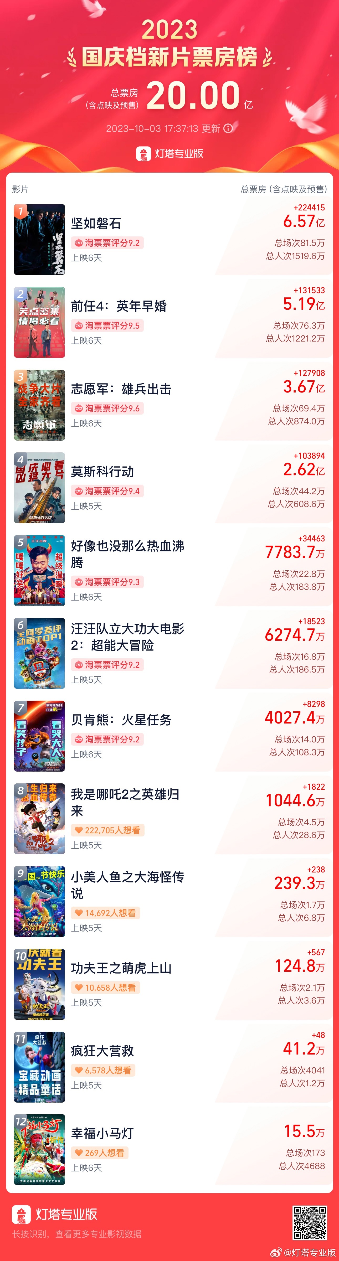 据灯塔专业版实时数据,2023年国庆档新片总票房(含预售)突破20亿,《坚如磐石》《前任4:英年早婚》《志愿军:雄兵出击》暂列前三位。