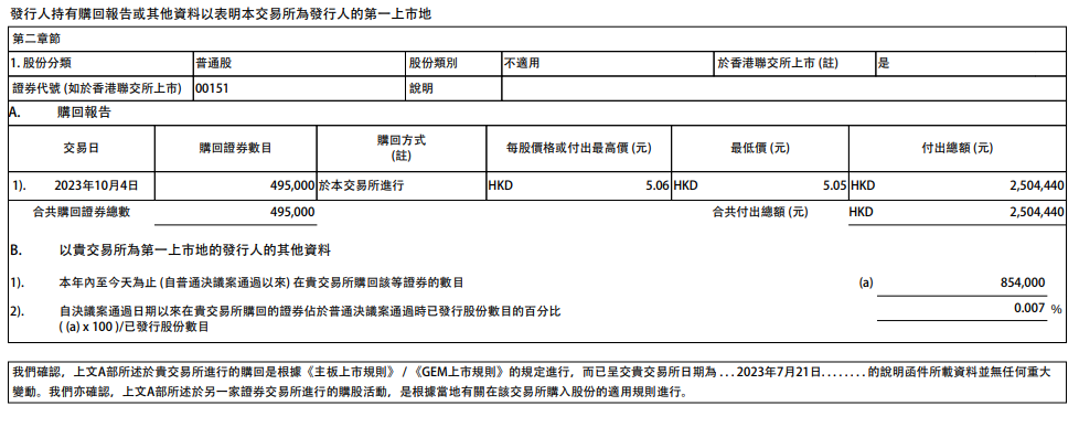 中国旺旺10月4日在港交所公告,公司10月4日耗资250.44万港元回购49.5万股公司股份,每股价格为5.05港元-5.06港元。