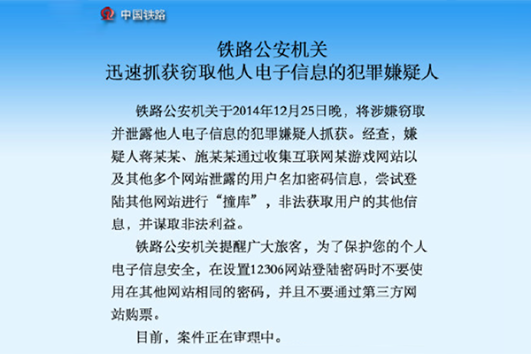 2014年12月,12306用户信息在网络疯传。官方网站称,此次泄露的用户数据不少于131,653条,信息内容包括账户、密码、身份证、邮箱等内容。