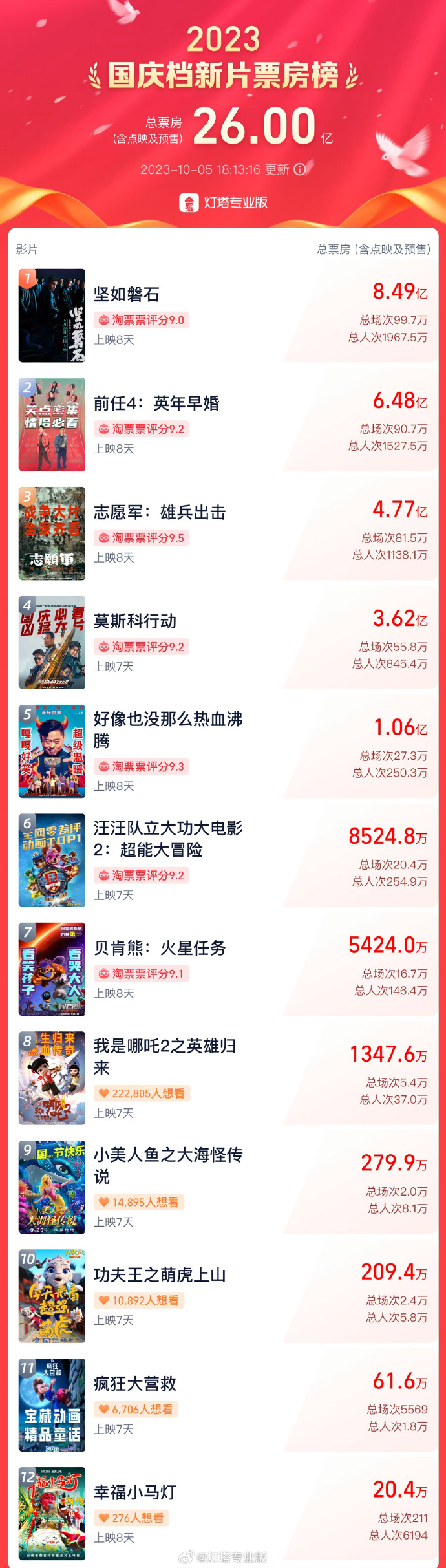 据灯塔专业版,截至10月5日18时13分,2023年国庆档新片总票房(含预售)突破26亿。《坚如磐石》《前任4:英年早婚》《志愿军:雄兵出击》暂列前三位。